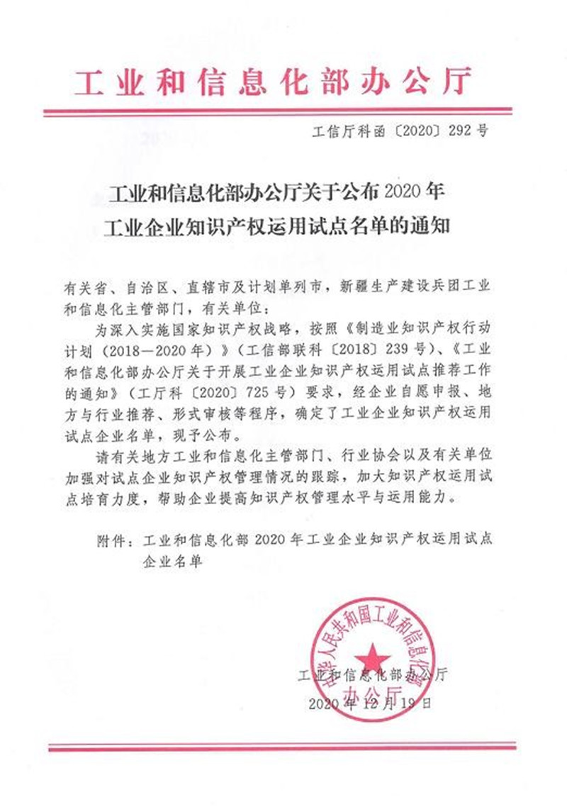 日前,國(guó)家工業(yè)和信息化部辦公廳發(fā)文公布,公司成功入選“2020年工業(yè)企業(yè)知識(shí)產(chǎn)權(quán)運(yùn)用試點(diǎn)單位”,山東省共入選109家知識(shí)產(chǎn)權(quán)運(yùn)用優(yōu)秀企業(yè)。